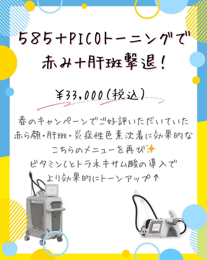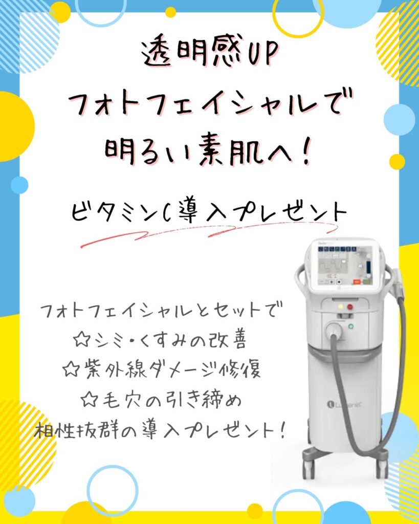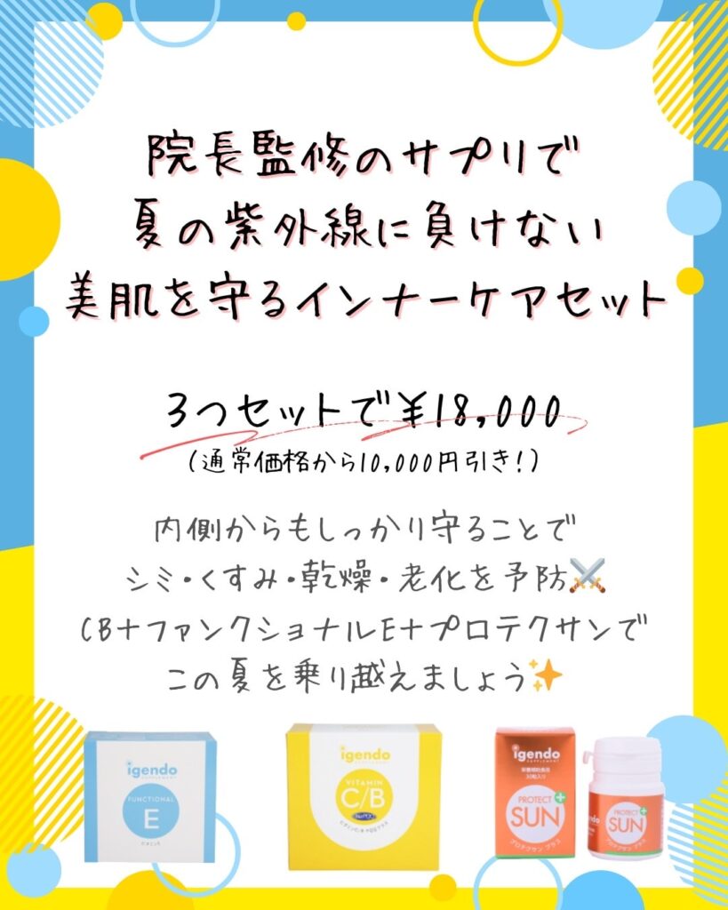 2025年夏 スペシャルメニュー キャンペーン情報2025.06.23 2025年夏の特別メニューを実施します。7月14日(月)~8月31日(日)限定の特別価格にてご案内!!人気の施術がお得に受けられるチャンスです。 この機会にぜひお試しください。 キャンペーン情報 医薬品・サプリメント料金改定のお知らせ 保険診療で対応可能な疾患一例 関連記事 キャンペーン情報 2024年夏の特別メニュー 2024.07.15 キャンペーン情報 2024年冬 移転1周年記念メニュー 2024.12.04