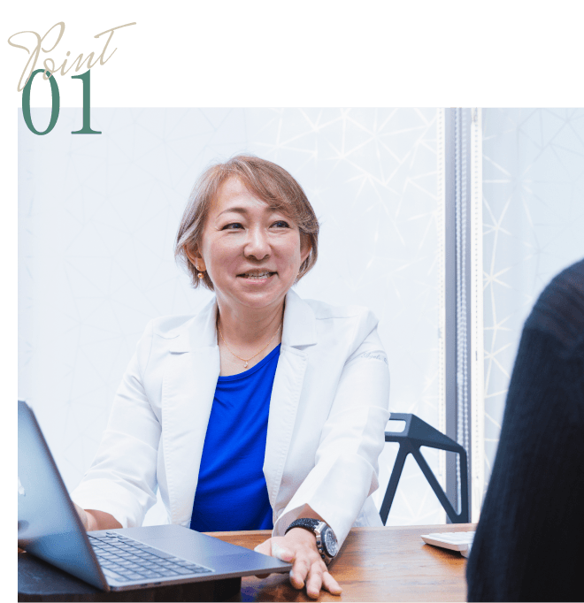 患者様一人ひとりの美しさや健康を総合的にサポートします。美容皮膚科・再生医療・体内からのアプローチなどの専門分野の知識と経験を組み合わせ、患者様のニーズやライフスタイルに合わせた最適な治療をご提案・施術致します。