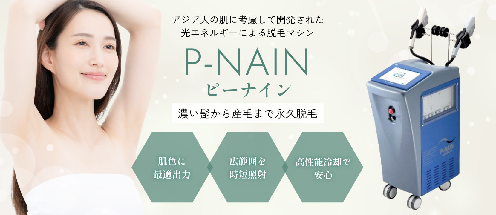 P-NAINは光エネルギー(IPL)による最新の脱毛マシンです。アジア人の肌に配慮して、日本人形成外科医・皮膚科医によって開発されました。